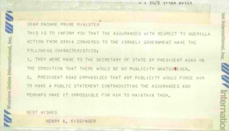 وتتعلق الوثائق، بالوساطة التي قام بها وزير الخارجية الأمريكي الأسبق هنري كيسنجر بين رئيسة الوزراء الإسرائيلية السابقة غولدا مائير والرئيس السوري الراحل حافظ الأسد.