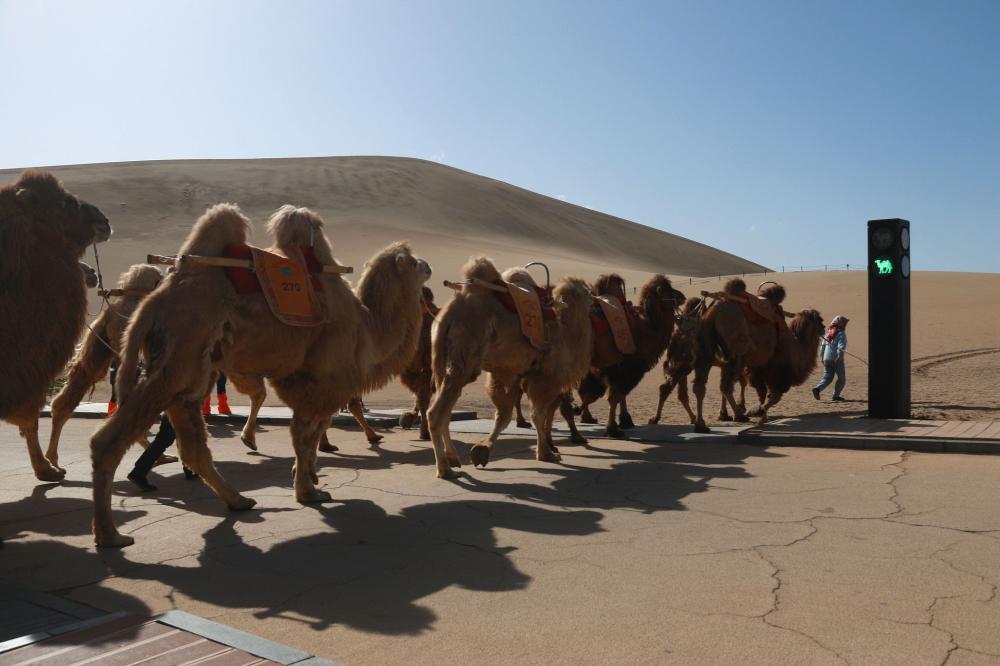 وفي عام 2023، كان هناك حوالي 2400 جمل متاحة للركوب، بالإضافة إلى عشرات الآلاف من السياح يوميًا في المناطق ذات المناظر الخلابة لجبل مينغشا وحدها، ما أدى إلى مشاكل ازدحام مروري خطيرة. وتوصلت السلطات المحلية إلى حل مبتكر، ألا وهو إشارات مرور الجمال.