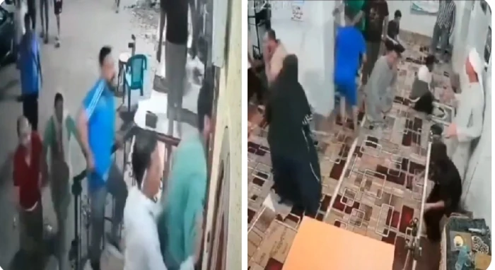وأظهر الفيديو الشاب يدخل مسرعًا إلى المسجد أثناء إقامة الصلاة، بينما يتبعه عدد من الأشخاص حاملين العصي، حيث اقتحموا المسجد وانهالوا عليه بالضرب داخل ساحة الصلاة، مما تسبب في حالة من الفزع بين المصلين وانقطاع الصلاة.