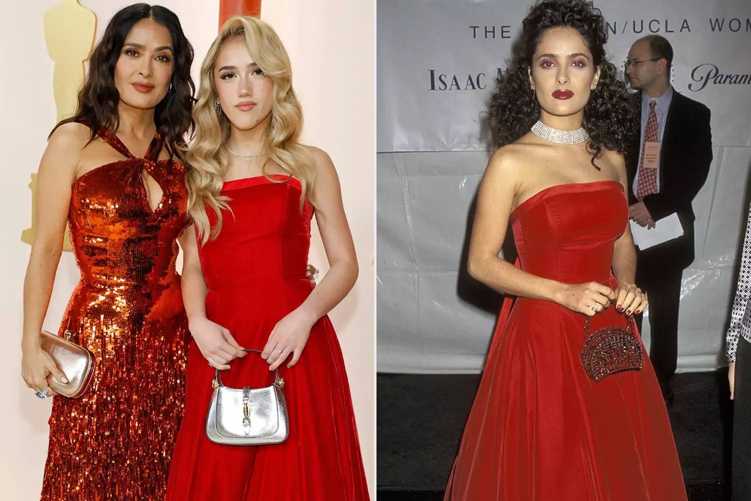 أذهل الثنائي الأم وابنتها العالم بإطلالات حمراء تكميلية في حفل توزيع جوائز الأوسكار لعام 2023. كانت الفتاة البالغة من العمر 15 عاماً ترتدي ثوب والدتها من توقيع إسحاق مزراحي.
