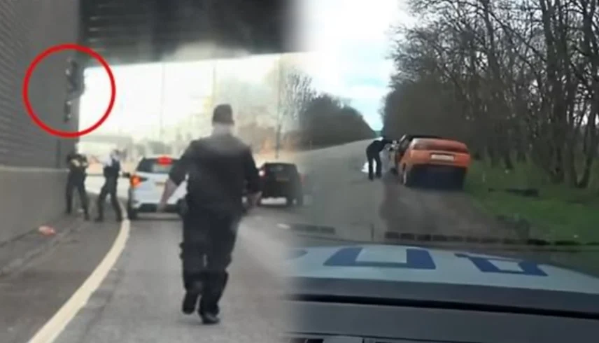 ولم تكن محاولة الفرار بالسيارة هي المشهد الوحيد المثير في هذه القصة، ففي النهاية التقطت كاميرات المارة السائق، وهو يرتدي ملابس سوداء بالكامل، ويركض مسرعاً على طول الطريق، ومع اقتراب ضباط الشرطة منه، اتخذ قراراً جريئاً وغير متوقع، حيث حاول تسلق جداراً ضخماً، بدا وكأنه يرتفع ما لا يقل عن 40 قدماً.