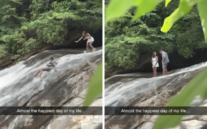 وفي الفيديو المتداول، يظهر الشاب وهو يركع ممسكًا بخاتم الخطوبة، قبل أن يفقد توازنه فجأة وينزلق ليسقط في الشلال، وسط صرخات الفتاة التي تابعت ما حدث بذهول وعجز.