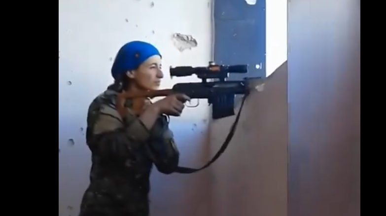 تناقل نشطاء على مواقع التواصل الاجتماعي فيديو لقناصة كردية كانت تصوب سلاحها باتجاه هدف غير ظاهر للمشاهد، قبل ان تباغتها رصاصة مرت بالقرب من رأسها واحدثت اثرا واضحا على الجدار بقربها.