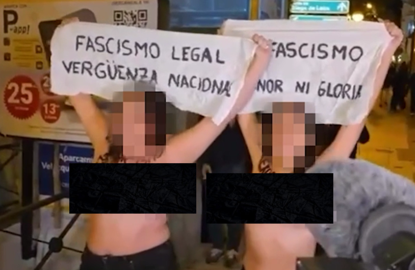وأظهرت اللقطات امرأتين عاريتي النصف الأعلى وهما تقفان خارج كنيسة في مدريد ، حيث كان يقام قداس بمناسبة ذكرى وفاة الدكتاتور الفاشي الإسباني فرانسيسكو فرانكو.