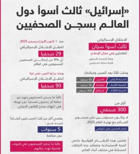 السياسي – أظهر تقرير إحصاء السجون للعام 2025 الصادر عن لجنة حماية الصحفيين، أن “إسرائيل” تعد ثالث أسوأ سجان للعاملين في مجال الإعلام، بعد الصين وميانيمار. حيث بدأت بسجن الصحفيين الفلسطينيين بوتيرة أكبر من السابق، خلال الحرب الإسرائيلي على غزة، في ظروف قاسية تهدد حياتهم.