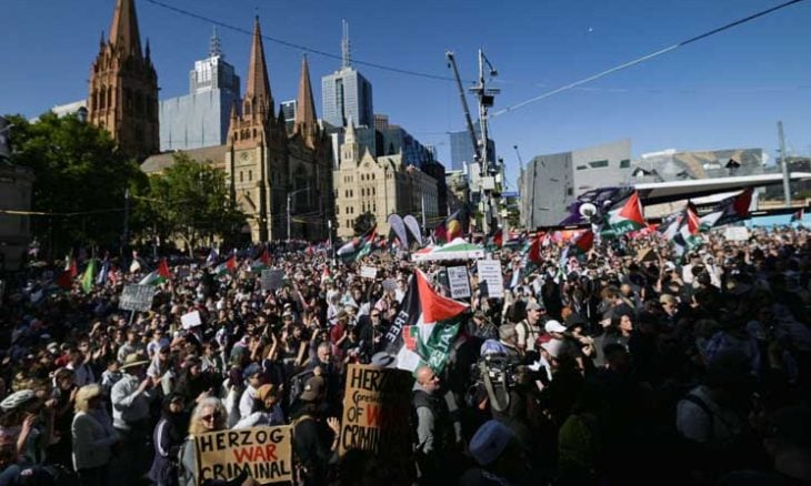 وتجمع حشد كبير أمام إحدى محطات السكك الحديدية الرئيسية في الحي التجاري المركزي في ملبورن الخميس. وارتدى عدد من المتظاهرين الكوفية ولوحوا بالأعلام الفلسطينية.