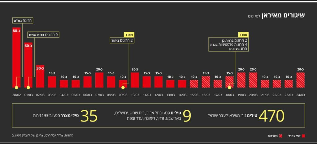 خلال الأيام الـ25 الأولى من الحرب، أطلقت إيران نحو إسرائيل حوالي 470 صاروخًا. بعد ثلاثة أيام أُطلق خلالها نحو 170 صاروخًا، انخفض معدل الإطلاق اليومي واستقر عند 10–15 صاروخًا يوميًا. في نهاية الأسبوع الماضي ارتفعت وتيرة الإطلاق قليلًا، وأمس (الثلاثاء) أُطلق نحو 20 صاروخًا.