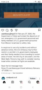 المعلومات تؤكد ان الاميركيين بدأوا إجلاء موظفيهم الvip من اسرائيل وتداول صحفيون رسالة مصدرها البريد الالكتروني الخاص بالسفير الأمريكي في إسرائيل لموظفيه : هذا هو اليوم الأخير لمغادرة إسرائيل – غادروا إلى أي دولة ممكنة
