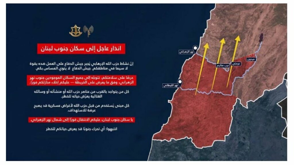 اصدر الجيش الإسرائيلي تحذيراً بالإخلاء لجميع سكان المنطقة الواقعة بين نهري الليطاني والزهراني، للمرة الأولى منذ حرب لبنان الأولى، إن لم يكن الأولى على الإطلاق.