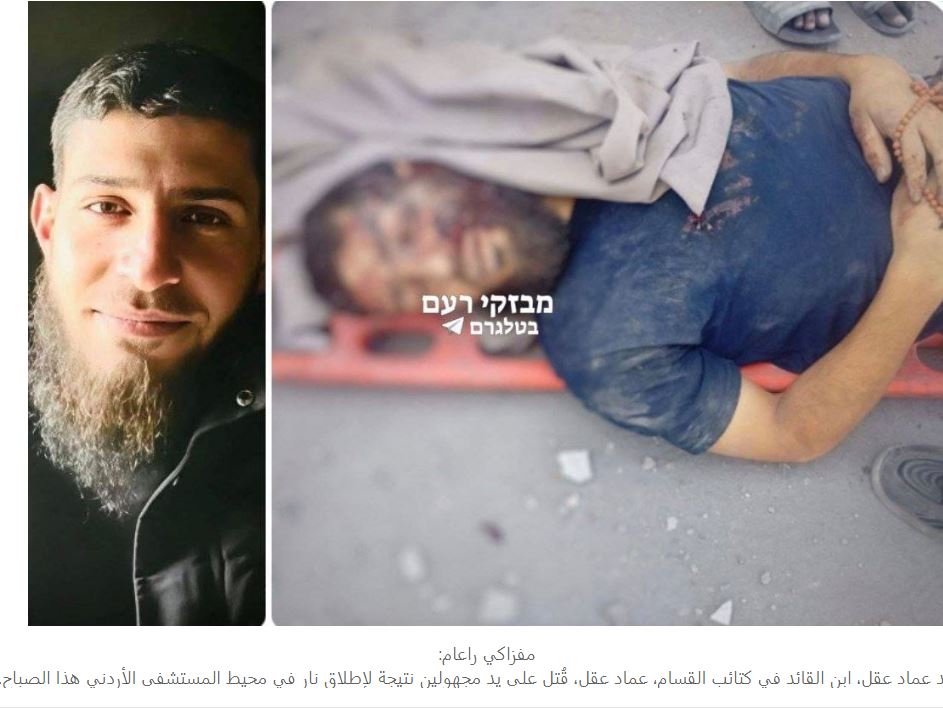 قالت مصادر اعلامية ان محمد عماد عقل، ابن القائد في كتائب القسام، عماد عقل، قُتل على يد مجهولين نتيجة لإطلاق نار في محيط المستشفى الأردني هذا الصباح.