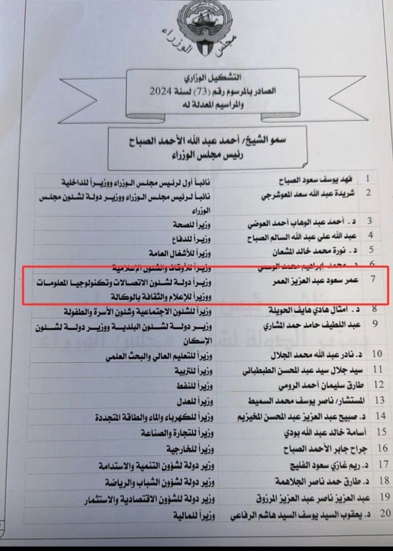 وبموجب الوثائق الرسمية كلف عمر بن سعود العمر بتولي مهام وزير الإعلام بالوكالة، فيما تضمن المرسوم الأميري تعيين وجوه جديدة في حقائب أخرى، منها الخارجية والمالية والتجارة والصناعة.