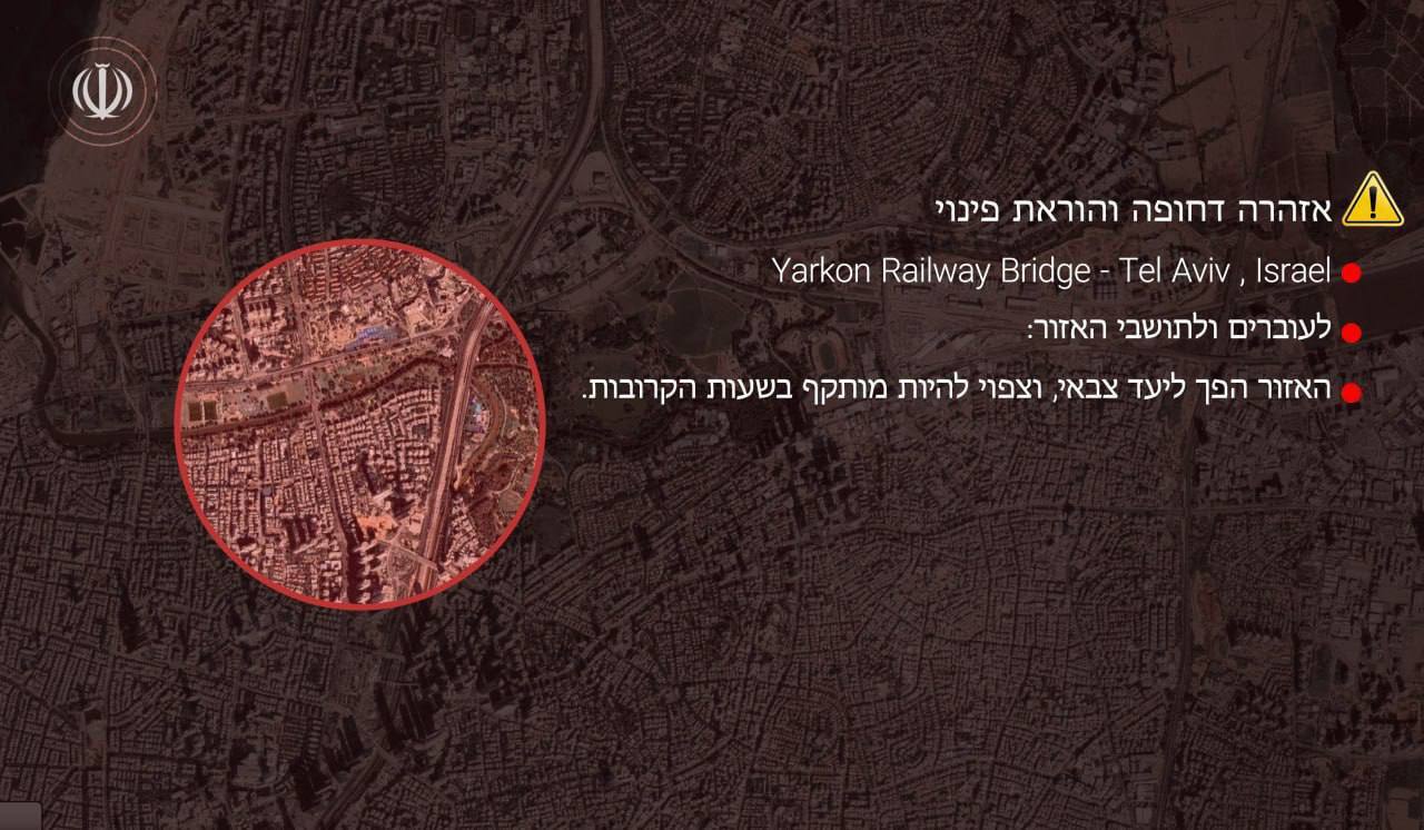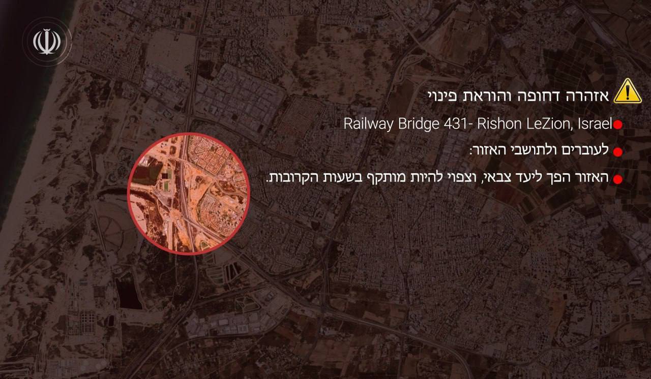 كما أهاب الحرس الثوري بالفلسطينيين في مدينة يافا (تل أبيب) بضرورة عدم الاقتراب جسر السكة الحديد رقم 8 على الطريق 431، وجسر سكة حديد اليركون في تل أبيب.