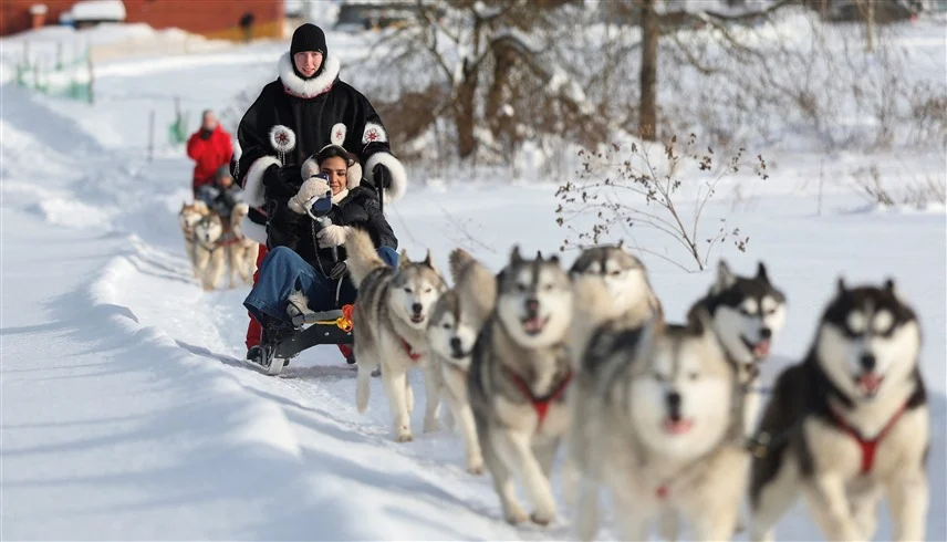 في درجات حرارة تحت الصفر المئوي بالقرب من موسكو، تجر مجموعات من كلاب “الهاسكي” زلاجات تحمل سائحين قادمين من سلطنة عُمان ودولة الإمارات عبر حقول مغطاة بالثلوج، في أجواء تبهج الزائرين الذين لم يسبق لهم خوض تجربة الشتاء الروسي.