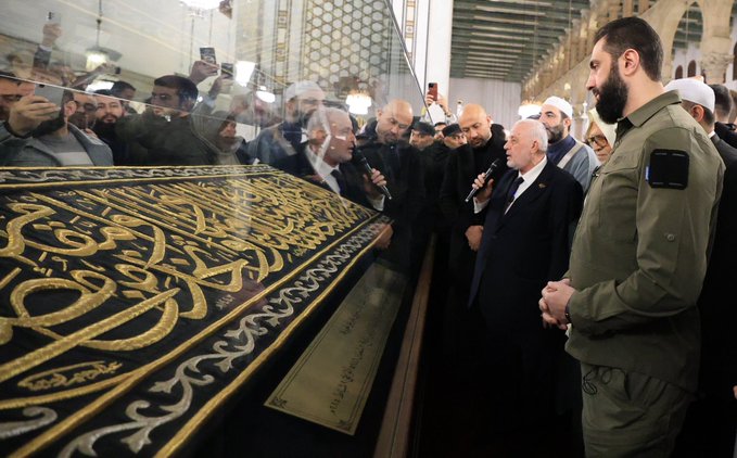 الشرع يضع قطعة من ثوب الكعبة المشرفة في المسجد الأموي بدمشق