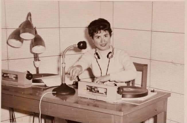 #سلوى حداد في استوديو إذاعة القدس في مقرها في مدينة رام الله عام ١٩٥٨