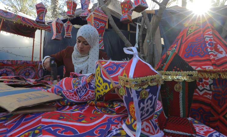 وأمام خيمتها، تجلس شراب (32 عاما) محاطة بمجموعة من تلك الكراتين التي تقصها إلى قطع صغيرة تشكّل هياكل الفوانيس، لتلصق عليها لاحقا أقمشة تحمل زخارف هندسية متداخلة الأشكال والألوان بطابع شرقي شعبي.