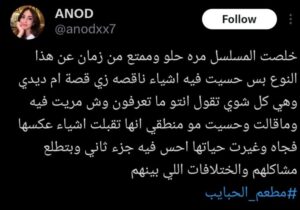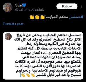 وتعليقاً على دور العمل في الترويج للأكلات المصرية، كتبت أخرى “مسلسل (مطعم الحبايب) يحكي عن تاريخ الأكل في المطبخ المصري، وكيف أن كل أكلة لها قصة مختلفة عن الأخرى، ومحاولة ربط الأحداث التاريخية بوصفة كل أكلة اشتهر بها المطبخ المصري”.