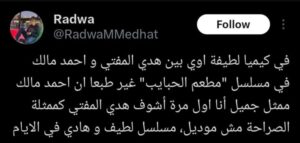 وكتبت إحدى الفتيات عبر حسابها بمنصة إكس “مسلسل (مطعم الحبايب) حلو وخفيف ولطيف ورومانسي وكوميدي”، فيما أشادت أخرى بتناغم الأداء بين بطلي العمل، كاتبةً “في كيمياء لطيفة بين هدى المفتي وأحمد مالك.. مسلسل لطيف وهادي”.