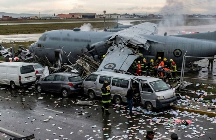وانحرفت طائرة النقل، وهي من طراز سي-130 هيركوليز، عن المدرج في مطار “إل ألتو الدولي”، وتحطمت في أحد الشوارع، ما أدى إلى تدمير العديد من السيارات وإلحاق أضرار بشاحنات، وفق ما أظهرت صور بثتها وسائل إعلام محلية.