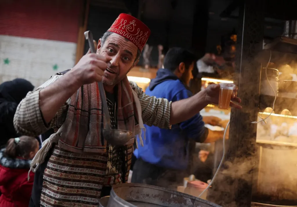 وصور الفيديو المسن وهو يمشي بخطوات هادئة وواثقة ويتوقف ليبحث عن بائع المسكرات، حيث سأل مقاتلا متأهبا: “كان هون بياع مشروبات عجب وين صار”.