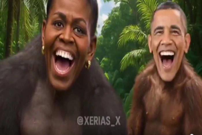 في الثانية 59 من الفيديو، يظهر فجأة مقطع مُولّد بالذكاء الاصطناعي يُظهر وجهي أوباما وزوجته مُركّبين على أجساد قردين، بينما تُعزف أغنية “الأسد ينام الليلة” – حيث يرمز “الأسد” إلى ترامب نفسه.