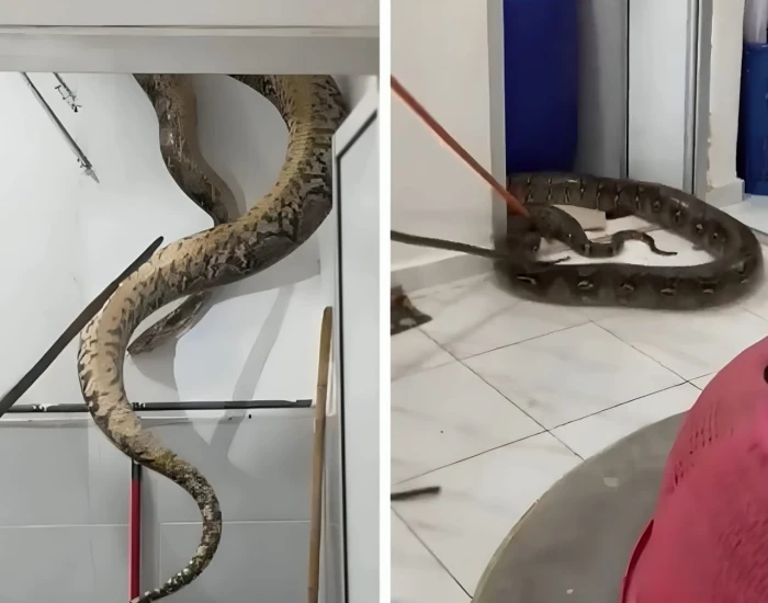 وظهر رجال الإنقاذ وهم يحاولون فتح جزء من السقف باستخدام خطافات طويلة، قبل أن ينزل الثعبان الضخم عبر الفتحة، ويتدلى ذيله حتى كاد يلامس أرضية الحمام، إذ تراجع رجال الإنقاذ للحظات، ثم عادوا للتعامل معه أثناء محاولته العودة إلى السقف.