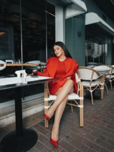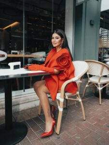 ظهرت الفنانة الانيقة بلباس احمر ناسب بشرتها واظهرت انوثة طاغية من خلال اللقطات