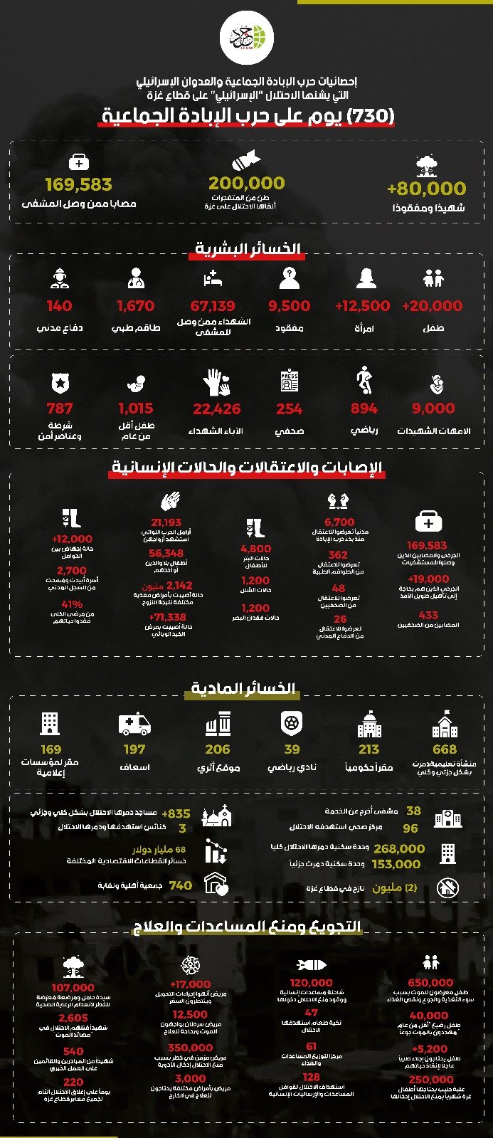 أما على الصعيد الاقتصادي، فقد بلغت الخسائر أكثر من 19 مليار دولار خلال عامين، وتم تدمير 70% من الأراضي الزراعية، و80% من الطرق الرئيسية، و92% من شبكة الكهرباء، و90% من أنظمة الصرف الصحي، ما جعل غزة منطقة غير صالحة للحياة.