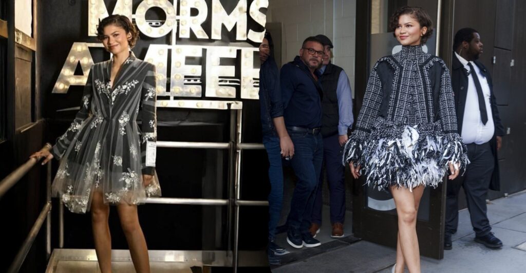 استغنت زيندايا عن الياقة الضخمة التي ظهرت في العرض الأصلي للمجموعة، وهو قرار موفق جعل الإطلالة تبدو أقل حدة وأكثر ملاءمة للقاء تلفزيوني دافئ، دون أن تفقد بريق “الهوت كوتور”.