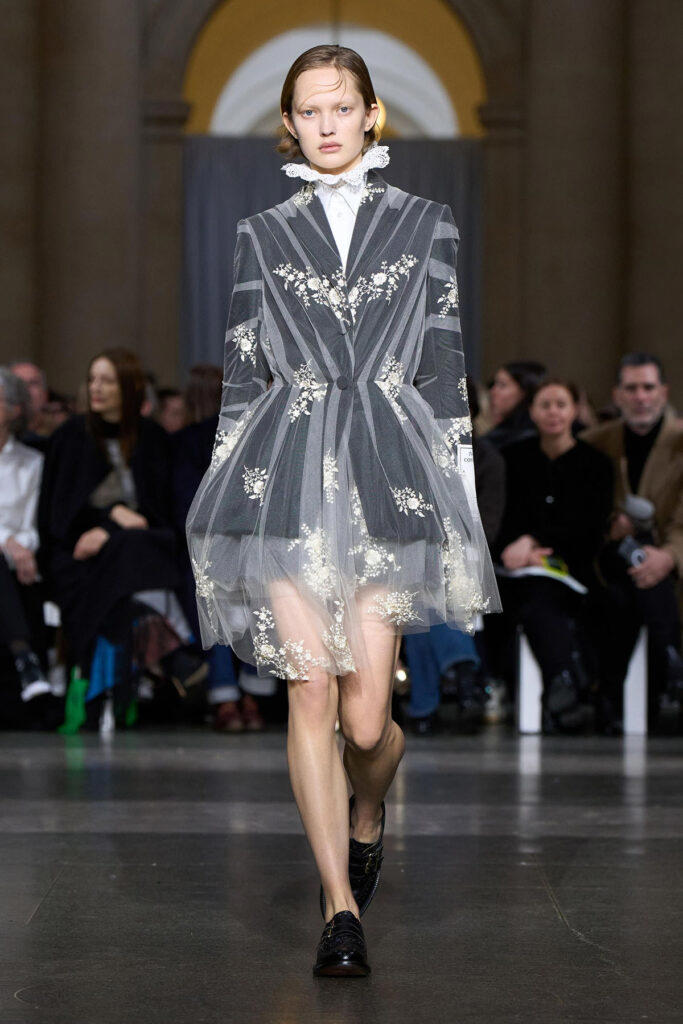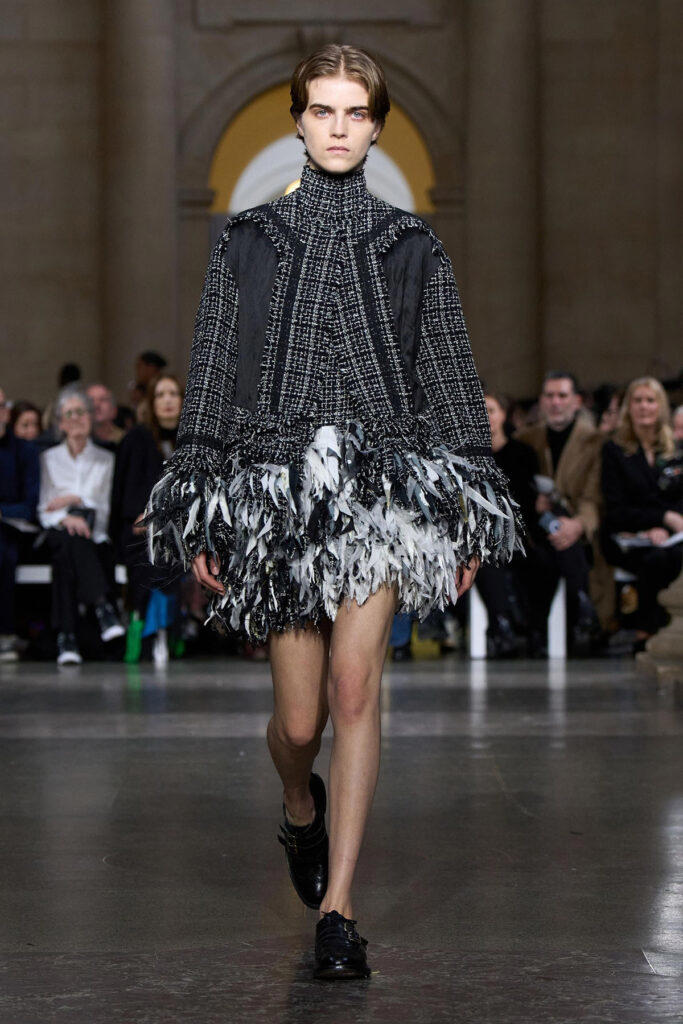 ارتدت جاكيت بليزر من قماش “البوكلي” (Bouclé) الفاخر، تحته فستان ذو خصر منخفض وياقة عالية، مكسو بالكامل بنسيج يشبه الريش.