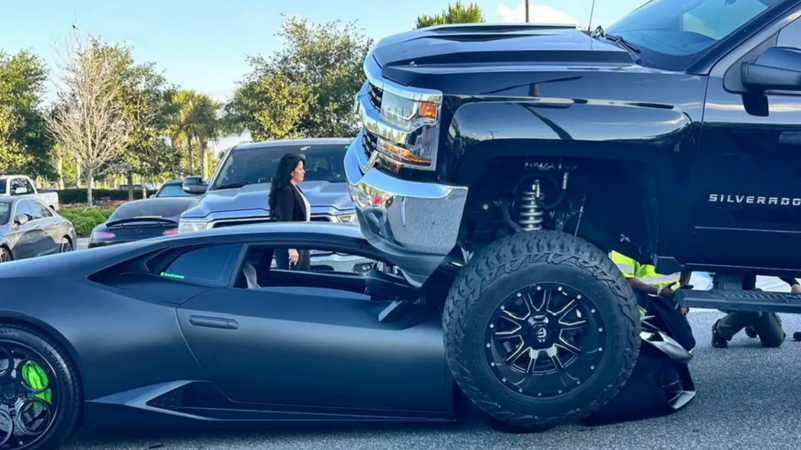 دهست سيدة تقود شاحنة تزن ثلاثة أطنان، سيارة لامبورغيني قيمتها 250 ألف جنيه إسترليني (حوالي 340 ألف دولار) في موقف سيارات بفلوريدا.