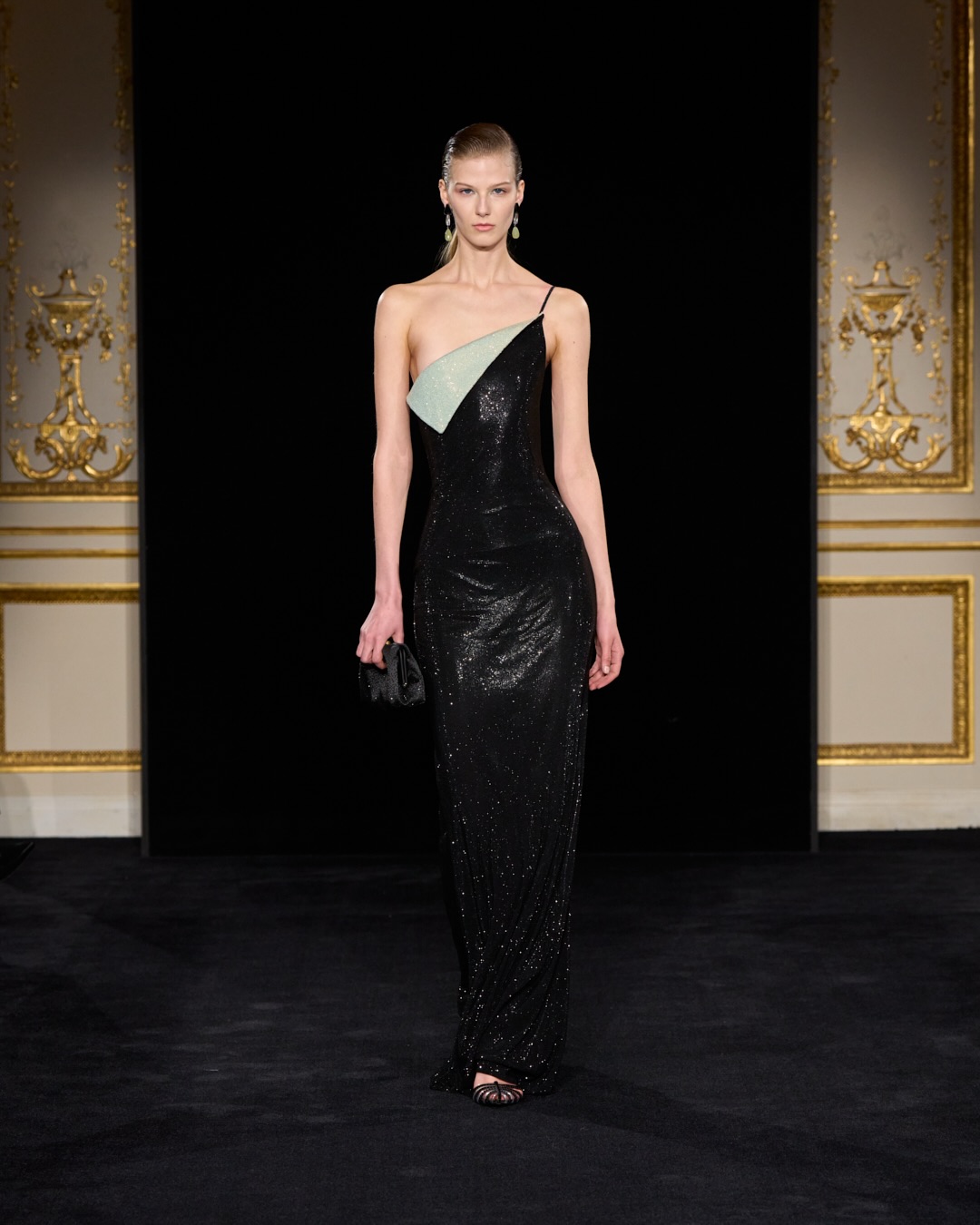 ساتان متدلٍ، صدريات مطرزة ببلورات دقيقة شفافة، عباءات ناعمة، خطوط انسيابية وقصّات مستقيمة، وصولاً إلى فساتين سهرة متلألئة… مجموعة تنغمس بالكامل في عالم جورجيو أرماني، دون أن تفقد حداثتها.