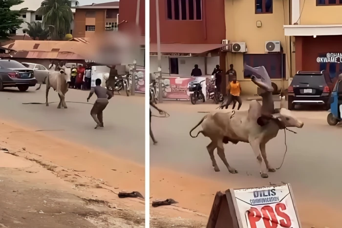 السياسي – تمكن شاب من التصدي لثور هائج والسيطرة عليه وسط شارع عام في غانا.