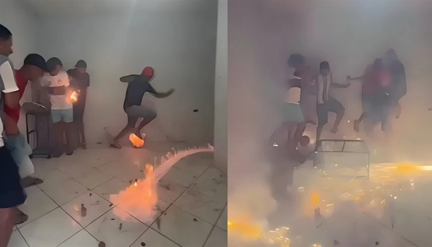 انتشر مقطع فيديو يظهر مجموعة من الشباب وهم يلعبون كرة القدم داخل غرفة مغلقة بينما تنفجر الألعاب النارية من حولهم، في مقطع فيديو أثار ضجة عالمية.