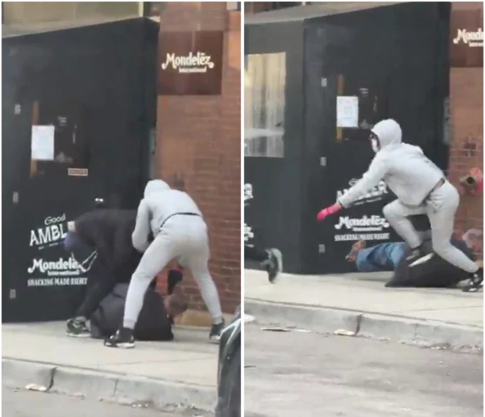 وأوضح الفيديو أن اثنين من اللصوص قاما بضرب رجل على الرصيف بعد أن أسقطاه أرضا.