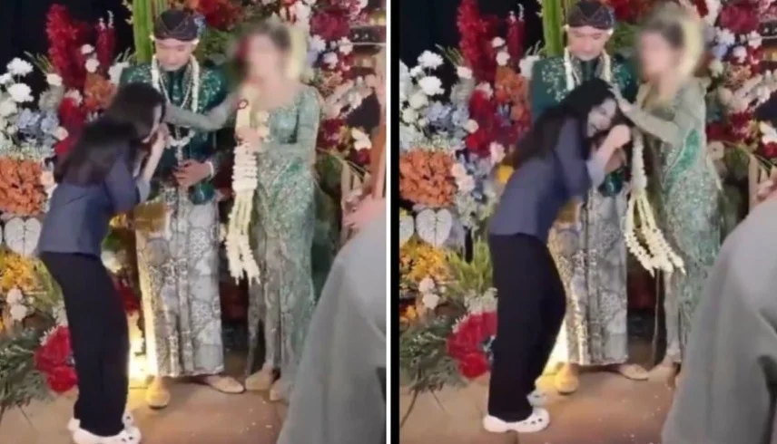 At an Indonesian wedding, the groom’s ex climbed the stage during photos and attempted to kiss his hand right in front of the new bride.