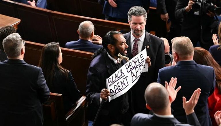 رفع نائب ديمقراطي من أصل إفريقي لافتة كتب عليها “السود ليسوا قرودا” خلال إلقاء الرئيس الأميركي دونالد ترامب خطاب حالة الاتحاد أمام الكونغرس مساء الثلاثاء، قبل أن يتم اقتياده خارج القاعة.