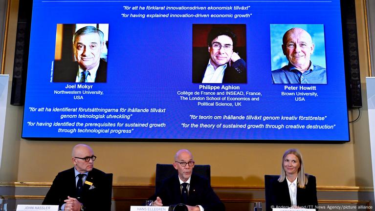 وأوضح جون هاسلر، رئيس لجنة جائزة نوبل للعلوم الاقتصادية: “يظهر عمل الفائزين أن النمو الاقتصادي لا يمكن أن يؤخذ كشيء مسلم به. يجب أن ندعم الآليات التي تكمن وراء التدمير الإبداعي حتى لا نعود إلى الركود”.