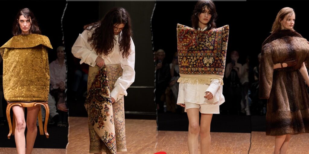 فقد حضرت التنانير وكأنها مصنوعة من السجاد، وظهرت المرايا كقطع تُرتدى على الرأس، فيما تحوّل أثاث المنزل إلى ما يشبه الرداء أو الهيكل المحيط بالجسد. حتى بعض الإطلالات بدت كما لو أنها خرجت من فكرة “لبس الأشياء كما هي”، لا كما يجب أن تكون. هنا الجاكيتات والمعاطف تُلبس بالمقلوب، وهناك القطع تُقلب وظيفتها بالكامل، لتتحول من شيء يومي مألوف إلى جسم غريب فوق الجسد.