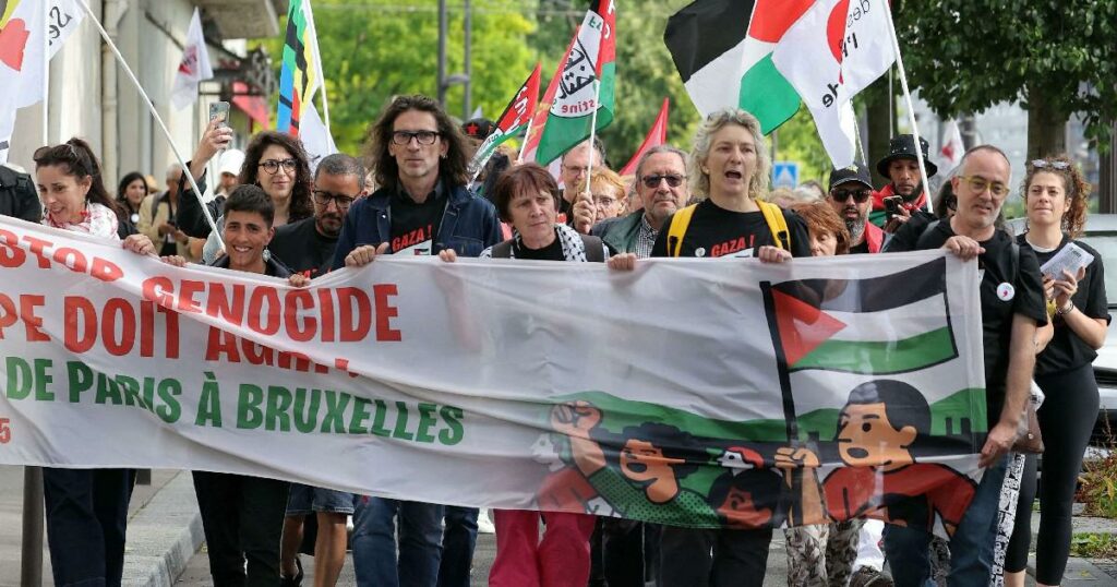 وردد المتظاهرون شعارات من قبيل “أفق أوروبا، لا يمكنك الاختباء، نحن نتهمك بالإبادة الجماعية!”.