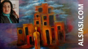 تقف الشخصية في منتصف اللوحة واقفةً في الماء كمن يقف على عتبة العالمين، لا هي في البر الصلب ولا هي في العمق الغارق، وهذه الصورة تستحضر من التراث الروحي الإنساني مفهوم “البرزخ” … تلك الحال بين حالين، تلك اللحظة المعلقة بين انتماء ضائع ومصير لم يتشكّل بعد، والمبنى خلفها لا يمنحها ملجأً بل يضغط عليها بثقله المعماري والنفسي، كأن الحجارة التي شيّدها الإنسان تحاصره اليوم، وهنا تُلمح الفنانة إلى فلسفة المكان عند إدوار سعيد حين قال إن المكان يسكن فينا قدر ما نسكن فيه … لكن الخطر يبدأ حين يغدو المكان سجناً لا وطناً.