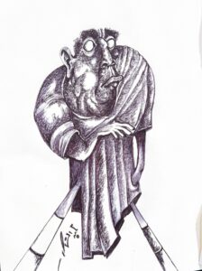 العصي الثلاث هي أعمدة وهمية لكبرياء، ذاكرة، إرادة. كلما ازداد ضغطه عليها ليحافظ على “وقفته”، كلما انغرست قمة الخازوق الحاد أعمق، متوسعة في اللحم والروح بثقب أسود من الألم.