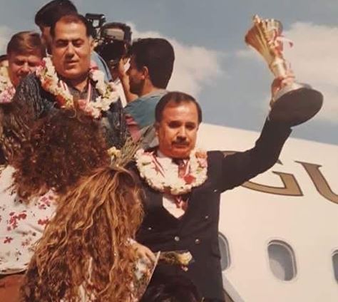 رئيس بعثة منتخبنا إلى كأس آسيا للشباب في اندونسيا عام ١٩٩٤ مروان عرفات حاملاً كأس البطولة على سلم الطائرة عند عودة البعثة إلى دمشق