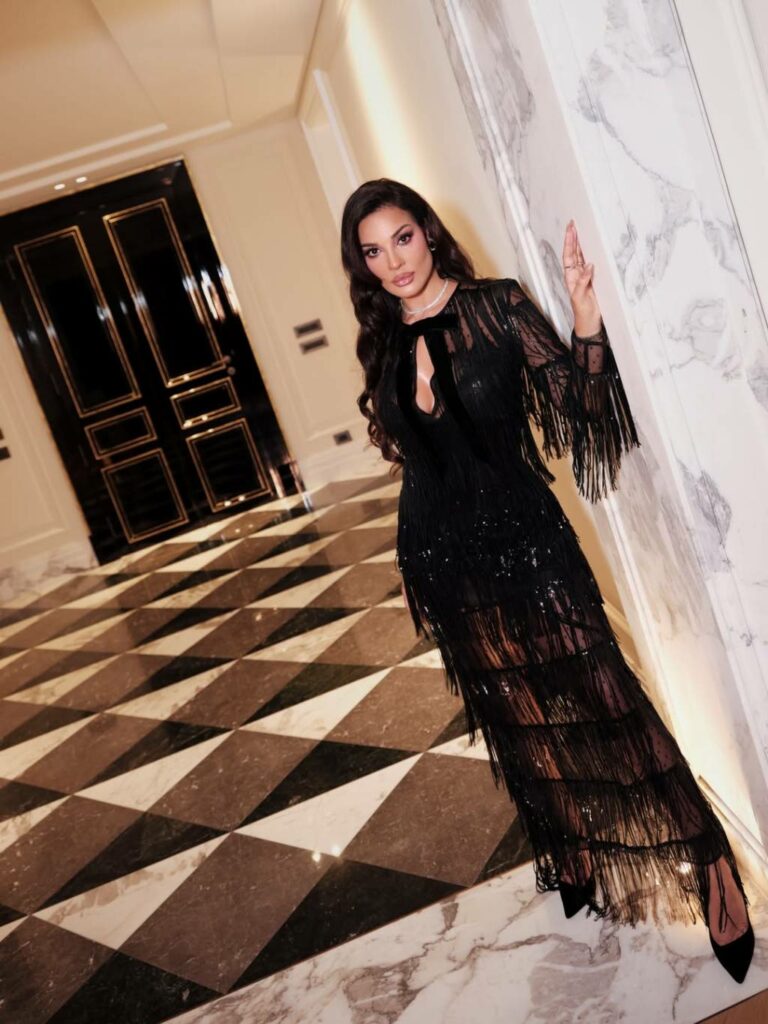 اختارت نادين نسيب نجيم إطلالة جريئة ولافتة اعتمدت فيها على الشراريب اللمّاعة كعنصر أساسي، لتؤكد مرة جديدة قدرتها على مواكبة الصيحات الجريئة بأسلوب أنيق ومتوازن. الشراريب الكثيفة والمنسدلة من الفستان منحت الإطلالة حركة وحيوية، وجعلتها لافتة بكل تفاصيلها.