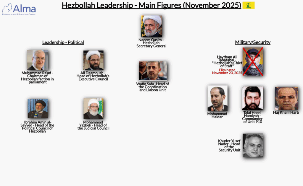 وقال انه وبعد القضاء على هيثم علي طباطبائي في 23 نوفمبر، فيما يلي خريطة لأبرز الشخصيات في القيادة السياسية والحكومية والعسكرية لحزب الله.
