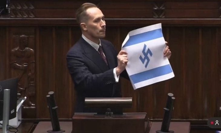 واستخدم النائب البولندي تعبير “الرايخ الثالث” المرتبط بـألمانيا النازية في وصف إسرائيل، كما رفع علما إسرائيليا يحمل رمز الصليب المعقوف، قائلا إن “إسرائيل ترتكب إبادة جماعية بوحشية أمام أعيننا”.