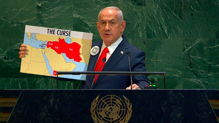 واستخدم نتنياهو خريطة للشرق الأوسط مع تمييز المحور الإيراني بـ”اللون الأحمر” كأداة مساعدة، كما شمل التصنيف كلًا من العراق وسوريا واليمن إلى جانب إيران.