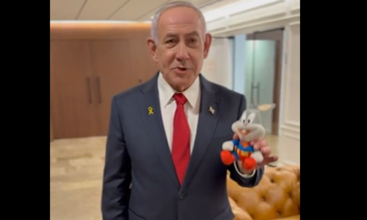 في الفيديو، رفع نتنياهو دمية على شكل شخصية الكرتون “باغز باني”، ساخرا من المدعين العامين الذين أشاروا إلى تلقيه دمية للشخصية كهدية لابنه قبل 29 عاما كدليل ضده.