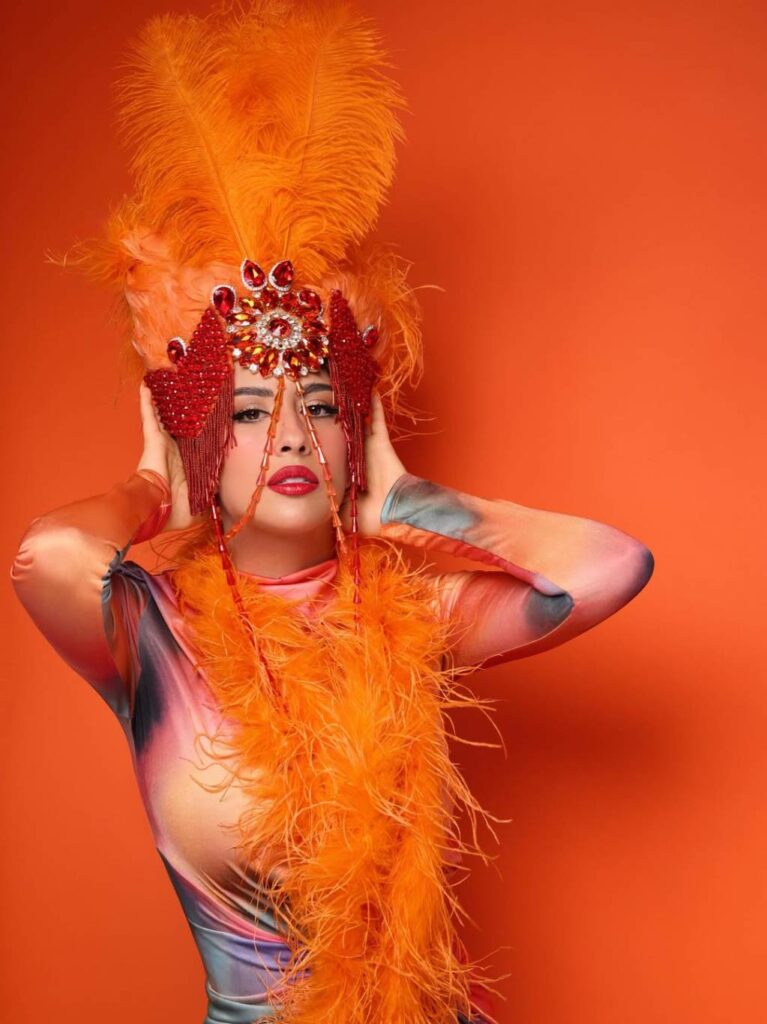 وظهرت الهادي في منشوراتها، بإطلالة مستوحاة من الطابع المسرحي على طريقة راقصات السامبا في الكرنفالات البرازيلية، من خلال الريش باللون البرتقالي والترصيعات الحمراء البارزة عند رأسها.