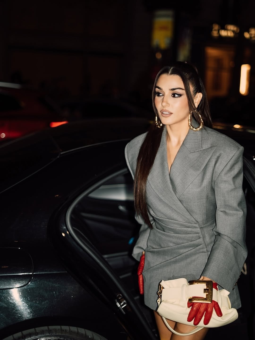 النجمة التركية هاندا أرتشيل اختارت فستاناً قصيراً بقصة البليزر من مجموعة Balmain، تميّز بياقة هندسية حادّة أضافت لمسة من القوة والجرأة إلى مظهرها. لكن ما جعل الإطلالة أكثر لفتاً للأنظار، اختيارها للقفازات الجلدية الحمراء والحذاء المطابق، لتكسر كلاسيكية اللون الأسود بإضافة درامية مشوّقة. كما نسّقت الإطلالة مع أقراط ذهبية ضخمة وحقيبة أوف-وايت من توقيع الدار نفسها، مما منح اللوك توازناً بصرياً واضحاً بين الجرأة والأناقة.